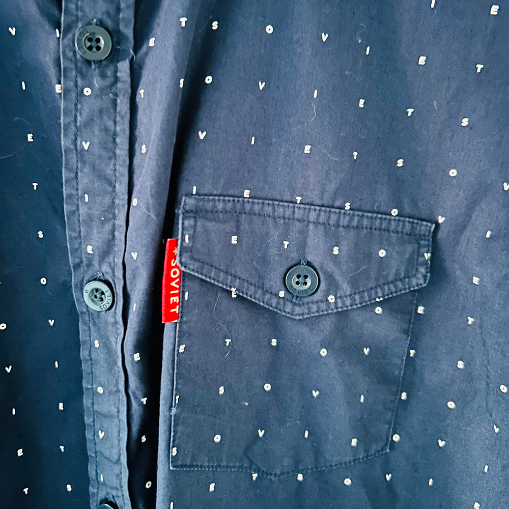 Button fastening. 1 front pocket. short sleeved. The word soviet used as the white print on the shirt